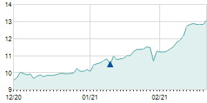 1/25/2019 +0.25 / +1.89% 13.10 13.50 13.10 13.45 13.15 9.12 2,130