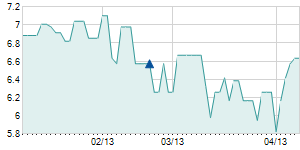 | 2/13/2023 | -0.30 / -5.77% | 5.20 | 5.20 | 4.60 | 4.90 | 4.90 | 3.81 | 73,300 |   |