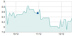 | 8/31/2016 | -0.10 / -0.80% | 12.50 | 12.50 | 12.20 | 12.40 | 12.33 | 3.65 | 52,470 |   |