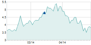 | 8/18/2016 | -0.40 / -2.70% | 14.80 | 15.00 | 14.40 | 14.40 | 14.61 | 9.43 | 968,420 |   |