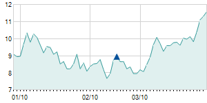| 7/31/2013 | -0.30 / -2.24% | 13.40 | 14.10 | 12.40 | 13.10 | 13.02 | 4.08 | 1,690,100 |   |