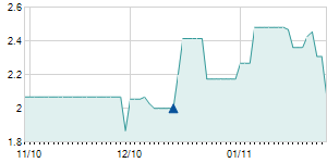 | 6/6/2011 | -0.10 / -2.17% | 4.60 | 4.60 | 4.50 | 4.50 | 4.50 | 2.77 | 2,900 |   |