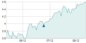 | 1/16/2012 | +0.30 / +2.61% | 11.50 | 11.90 | 11.50 | 11.80 | 11.80 | 1.49 | 553,980 |   |