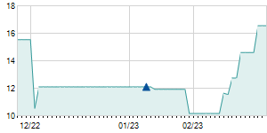 | 1/26/2022 | -0.20 / -1.48% | 13.70 | 13.80 | 12.80 | 13.30 | 13.17 | 11.09 | 635,700 |   |