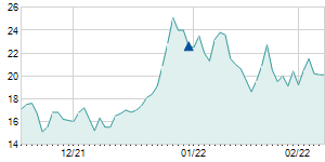 | 1/26/2018 | -1.00 / -4.44% | 21.20 | 21.90 | 21.00 | 21.50 | 21.34 | 18.57 | 343,000 |   |
