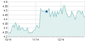| 1/8/2016 | 0.00 / 0.00% | 14.50 | 15.00 | 14.50 | 14.70 | 14.70 | 9.37 | 2,886,052 |   |