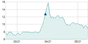 | 5/31/2022 | -0.55 / -3.20% | 16.80 | 17.05 | 16.30 | 16.65 | 16.76 | 8.80 | 29,300 |   |