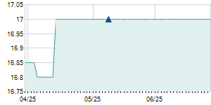 | 2/24/2021 | +0.20 / +1.18% | 16.90 | 17.10 | 16.90 | 17.10 | 16.98 | 9.79 | 122,200 |   |